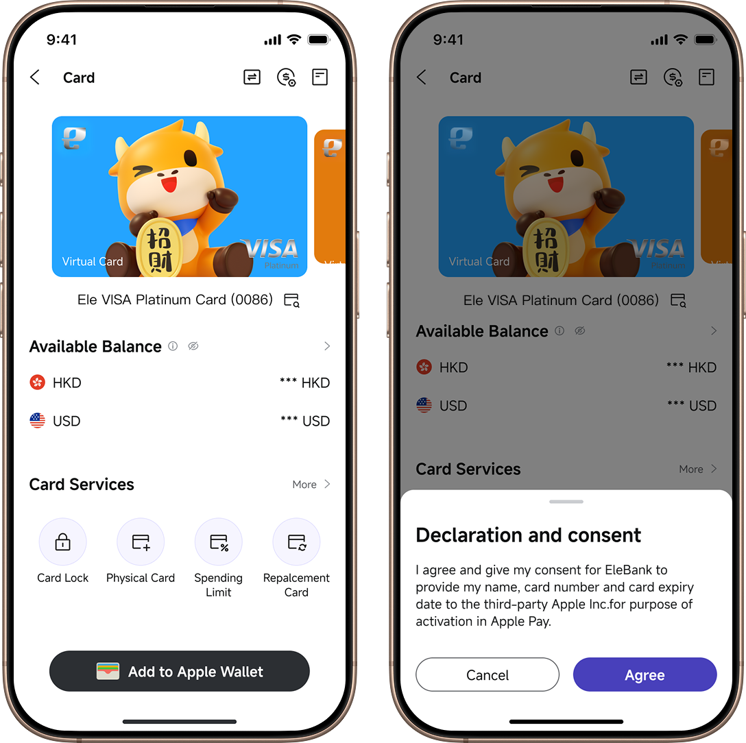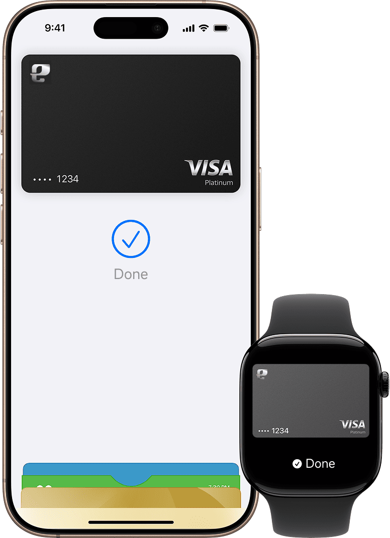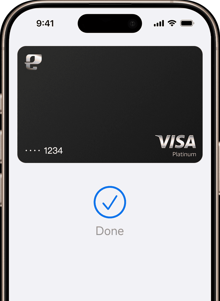 Apply EleBank Visa Platinum Card with our Bank App, add to Apple Pay right away, which uses the security features built into your Apple device, including Face ID and Touch ID—which are designed so only you can authorize payments.