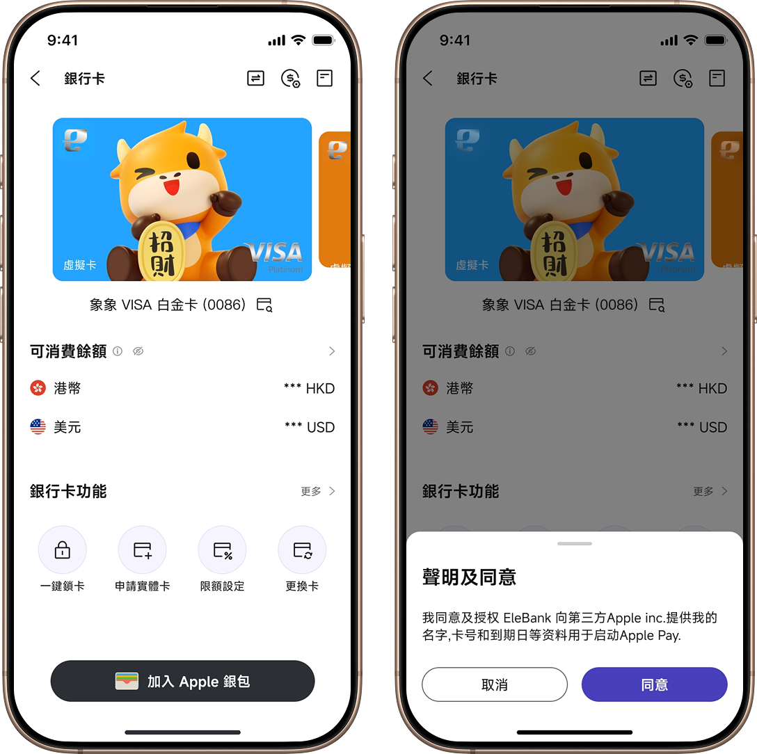 App申請象象銀行Visa白金卡,隨即加到Apple Pay,運用 Apple 裝置內置的安全功能,包括 Face ID 和 Touch ID,保證只有你可授權付款交易。