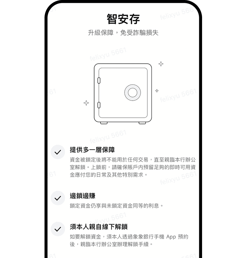 由香港金融管理局推出的反詐措施。透過象象銀行手機 App 啟用智安存可按需鎖定資金2,鎖定後將不能用於任何交易3,直至親臨本行辦公室解鎖